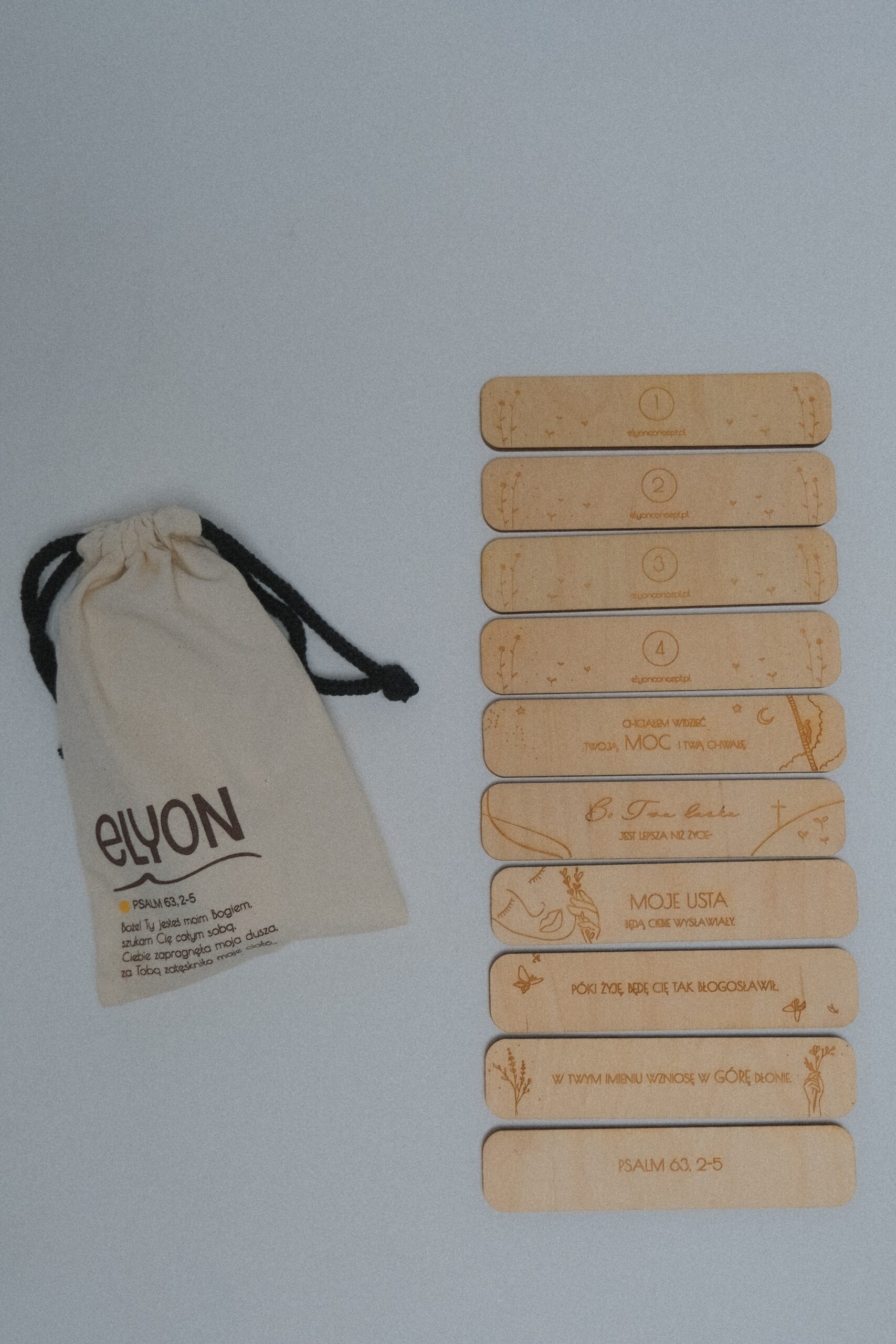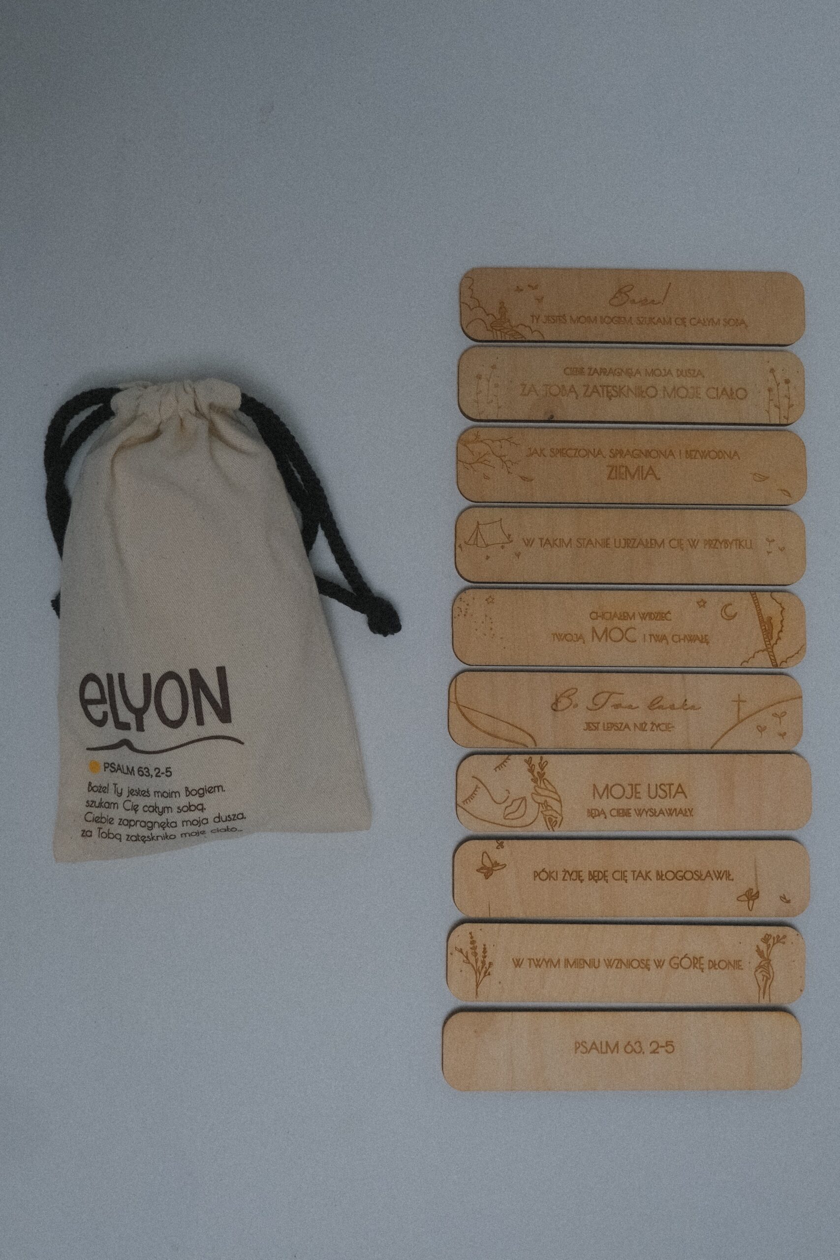 - 10 drewnianych płytek z fragmentem Biblii